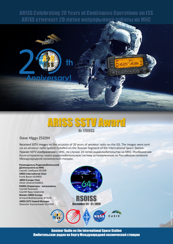 Between 24th and 31 December 2020 the ISS transmitted images for radio amateurs to download and collect. A set of 12 images in celebration of the 20th Anniversary of the ARISS program.